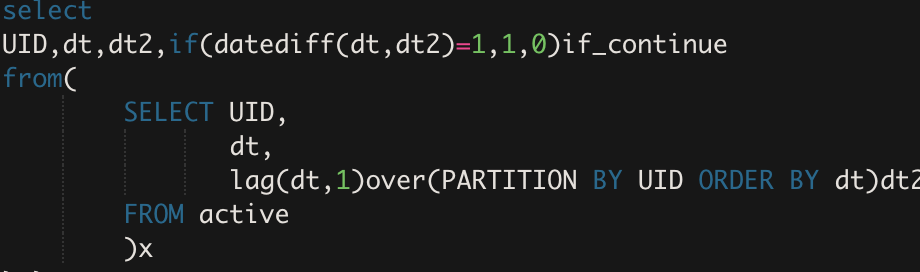 UID,dt,dt2,if(datediff(dt,dt2)=1,1,0)if_continue