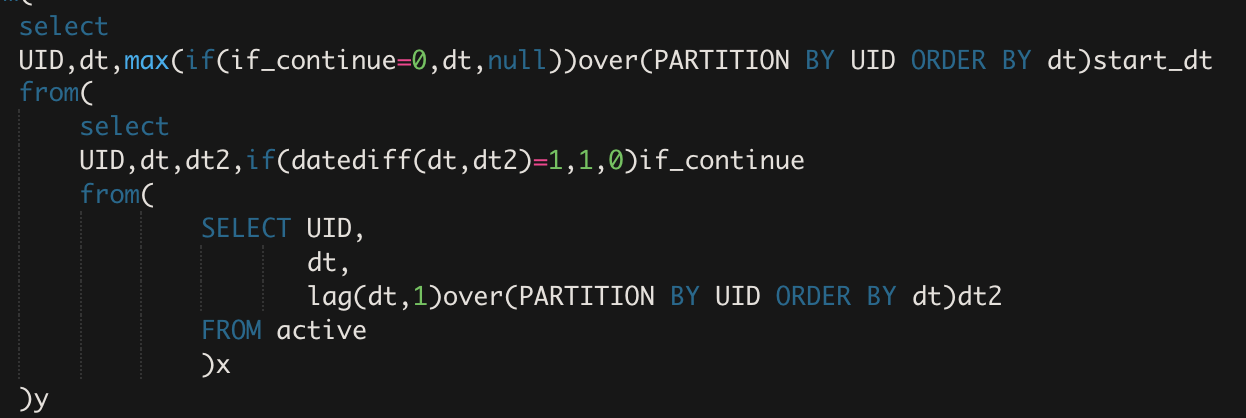 UID,dt,max(if(if_continue=0,dt,null))over(PARTITION BY UID ORDER BY dt)start_dt