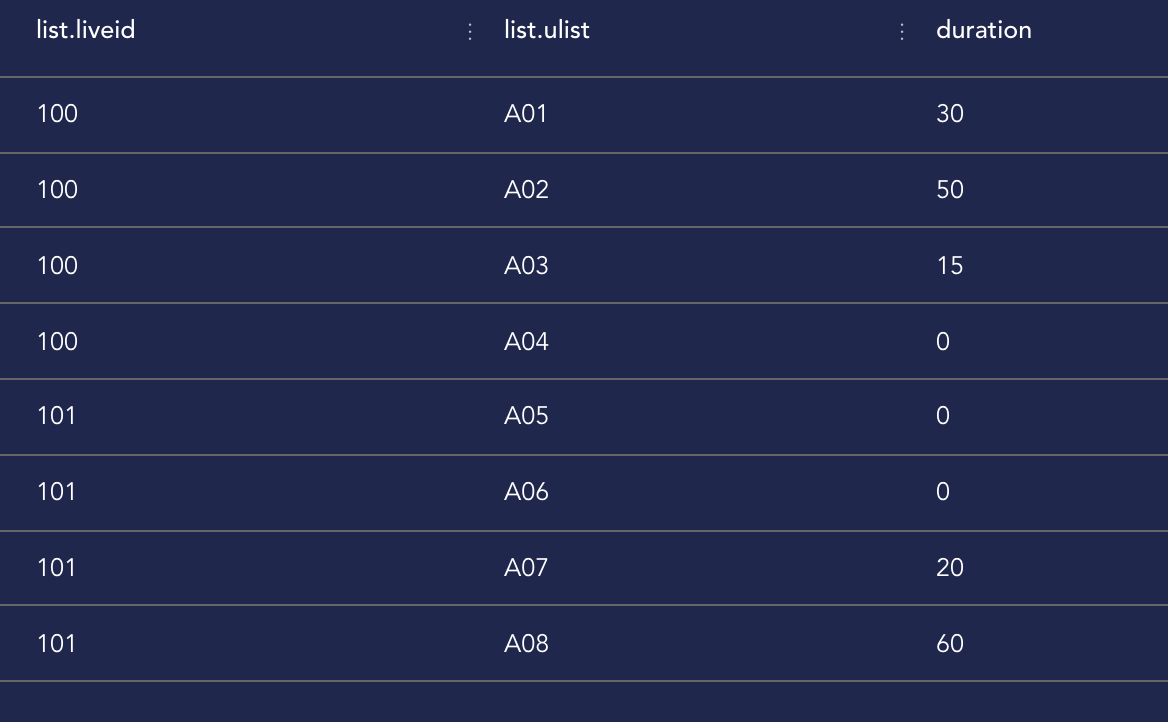 select 100 liveid,'A01' uid,30 duration union all