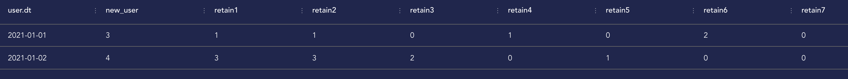 这种方法可能比较麻烦一些,得把要求的每一个留存指标都要单独写一个字段。若想省事儿,可以单独求出每日的新增数量,再将新增表与活跃表连接而求出每个注册日期在后续每天的活跃数量,然后将新增数量与活跃数量再进行关联,从而求得任意周期的留存。