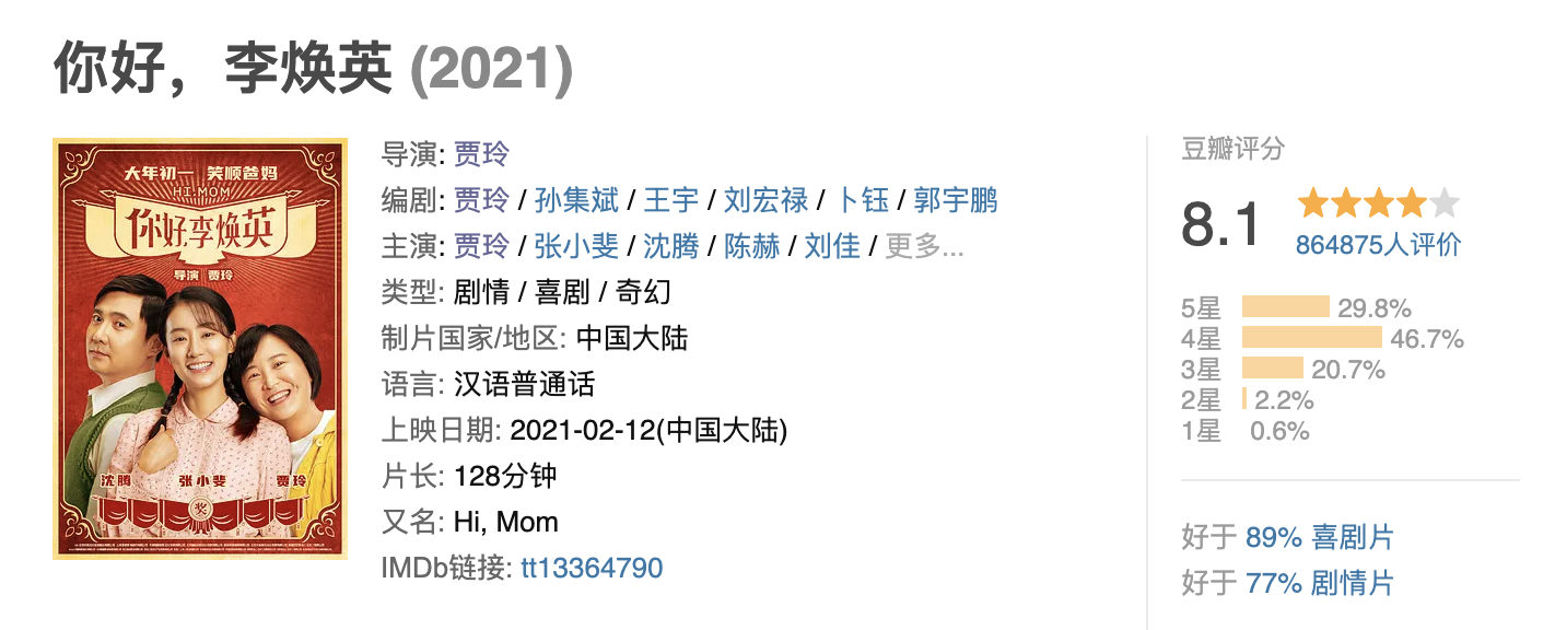 最近,贾玲导演的电影《你好,李焕英》在春节档一众电影中脱颖而出,成为了一匹黑马,更是中国影史上第三部票房破50亿的电影。